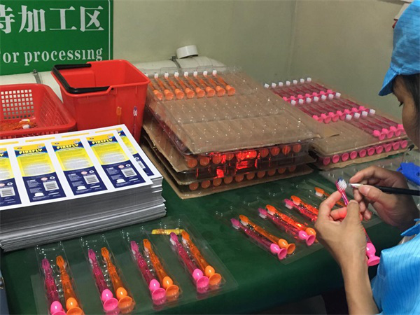 Jie Shang technology production and processing center is located in Humen Town, Dongguan City, built in 1994, with 35,000 square meters of industrial park, with more than 500 sets of automated processing equipment and a number of dust-free processing production lines. Products from the mold, injection molding, printing, planting hair, assembly, testing, packaging, the formation of one-stop production and processing operations. Annual production capacity of various types of toothbrushes, brushes, electric toothbrush 5 million.
